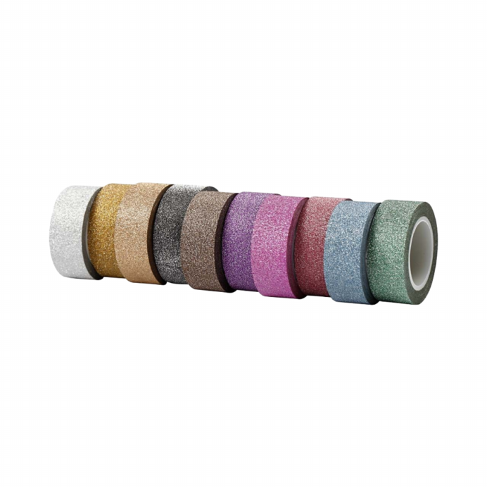 Laat je creaties schitteren met deze veelzijdige masking tape set met glittereffect! Deze set bestaat uit 10 verschillende tapes van elk 6 meter lang, uitgevoerd in diverse kleuren met een feestelijke glans. De tape is gemakkelijk met de hand afscheurbaar en hecht goed op papier, karton, foam en andere droge ondergronden.