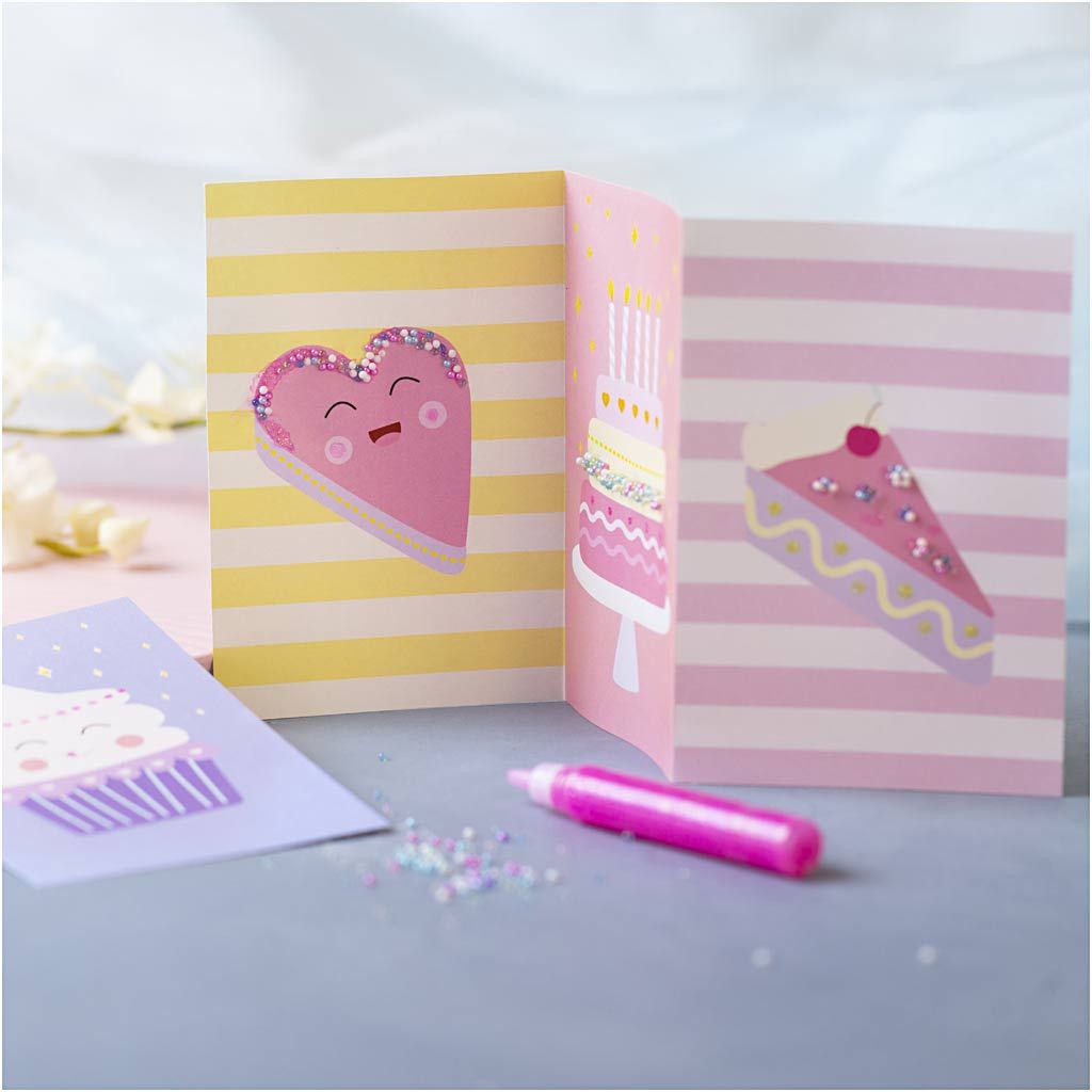 - Breng glitterlijm aan op de taartillustraties als ‘glazuur’.