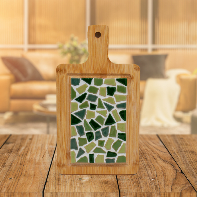 Maak een persoonlijke serveerplank met glanzende mozaïeksteentjes in groen tinten. De bamboe basis zorgt voor een stevige, duurzame plank met een stijlvolle look aan tafel.