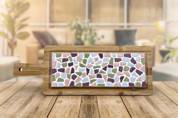 Maak een persoonlijke serveerplank met glanzende mozaïeksteentjes in pastel tinten. De bamboe basis zorgt voor een stevige, duurzame plank met een stijlvolle look aan tafel.