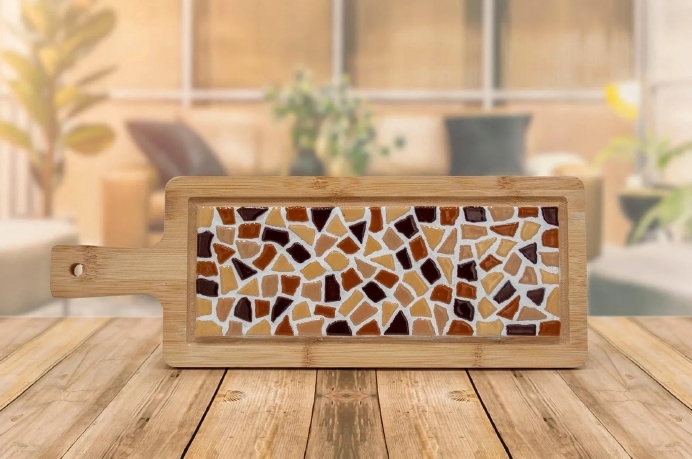 Maak een persoonlijke serveerplank met glanzende mozaïeksteentjes in zand tinten. De bamboe basis zorgt voor een stevige, duurzame plank met een stijlvolle look aan tafel.