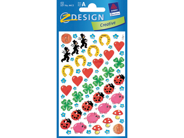 Vier kleine geluksmomenten met geluksbrenger-stickers zoals klavertjes, hoefijzers en meer.