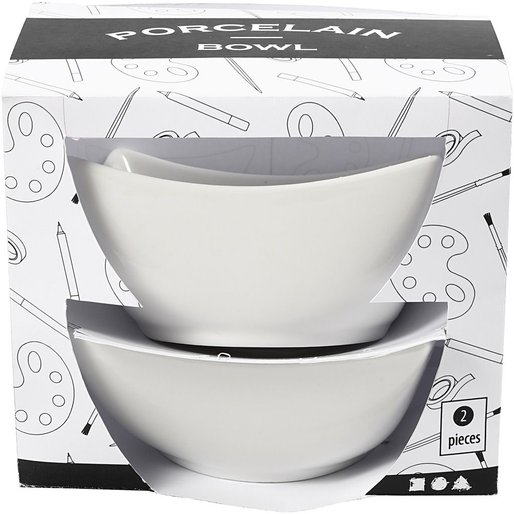 Set van twee compacte, witte porseleinen schaaltjes die je direct kunt gebruiken of creatief kunt personaliseren. Ideaal voor porseleinverf en -stiften, transfer/decoupage of eenvoudige lijntekeningen. Perfect als sierschaaltje, ring dish, theelicht-schaaltje of voor kleine snacks (droog en koud).