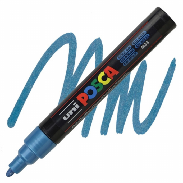 Gebruik de Posca 5M Metallic Blauw voor glanzende decoraties, magische details en lichteffecten op props of creatieve projecten. Combineer met zilver of wit voor een koel, helder contrast.