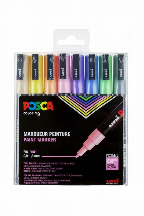 De Posca Set 3M – 8 stuks – Assortiment Pastel is de dunste Posca-marker in het assortiment: ideaal voor precisiewerk, outlines en sierlijke handlettering. De verfachtige, dekkende inkt hecht op vrijwel alle ondergronden en is reukarm, wat hem favoriet maakt bij zowel gevorderde makers als starters.