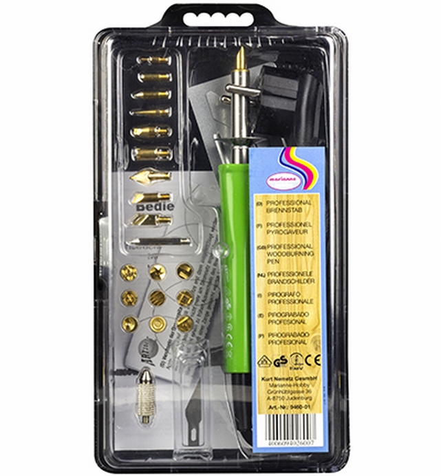Deze houtbranderset is voorzien van totaal 19 tools, plus een snijmes,