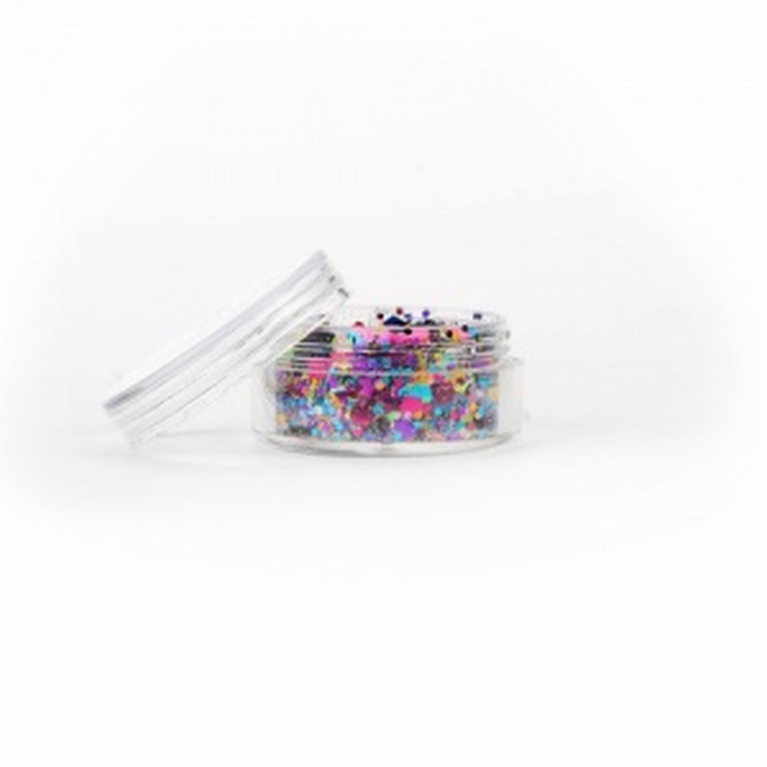 De Chunky mix wordt ook wel festivalglitter genoemd. De Waste Chunky mix ziet er spectaculair uit. Maar het is ook prima te verwerken in je haar. In de mix van glitter zitten verschillende glitters in verschillende mate (en soms ook kleuren). Het geeft makkelijk en snel een feestelijke resultaat. Alleen al dit gave glittertje en je hebt een partylook In het potje zit 8ml aan chunky glitter.
