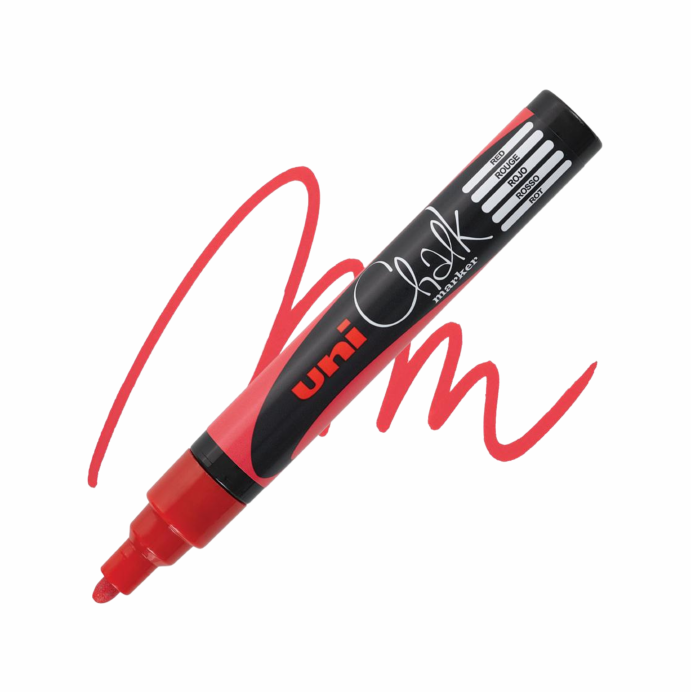 Geef kracht aan je boodschap met de Uni Chalk Marker 5M in rood, Deze krijtstift op waterbasis is ideaal voor tijdelijke decoraties en markeringen op gladde oppervlakken zoals glas, krijtborden, spiegels, whiteboards en kunststof, De diepe, levendige rode kleur zorgt voor maximale zichtbaarheid en een professionele uitstraling – of je nu informeert, decoreert of inspireert,