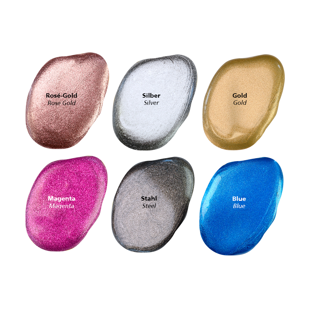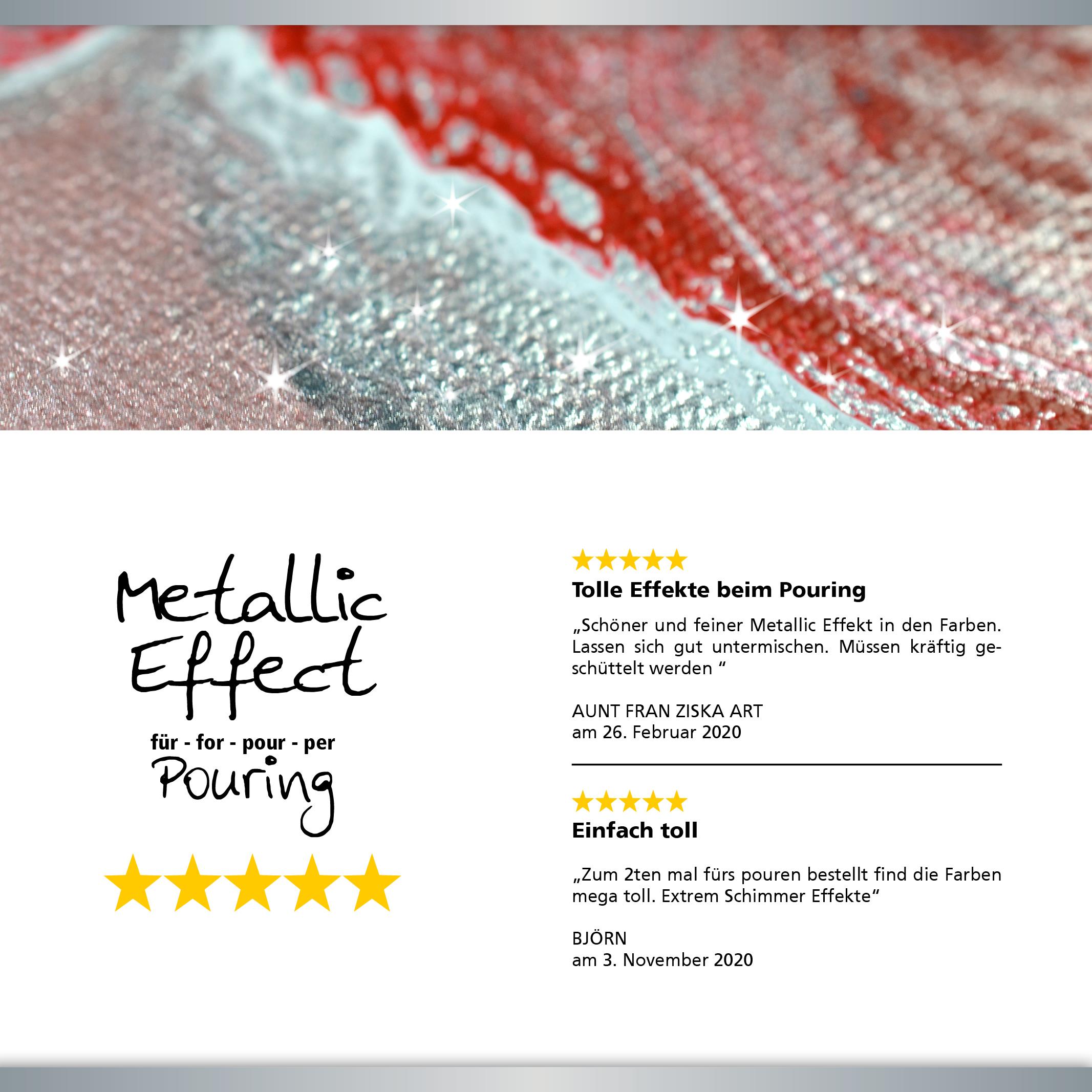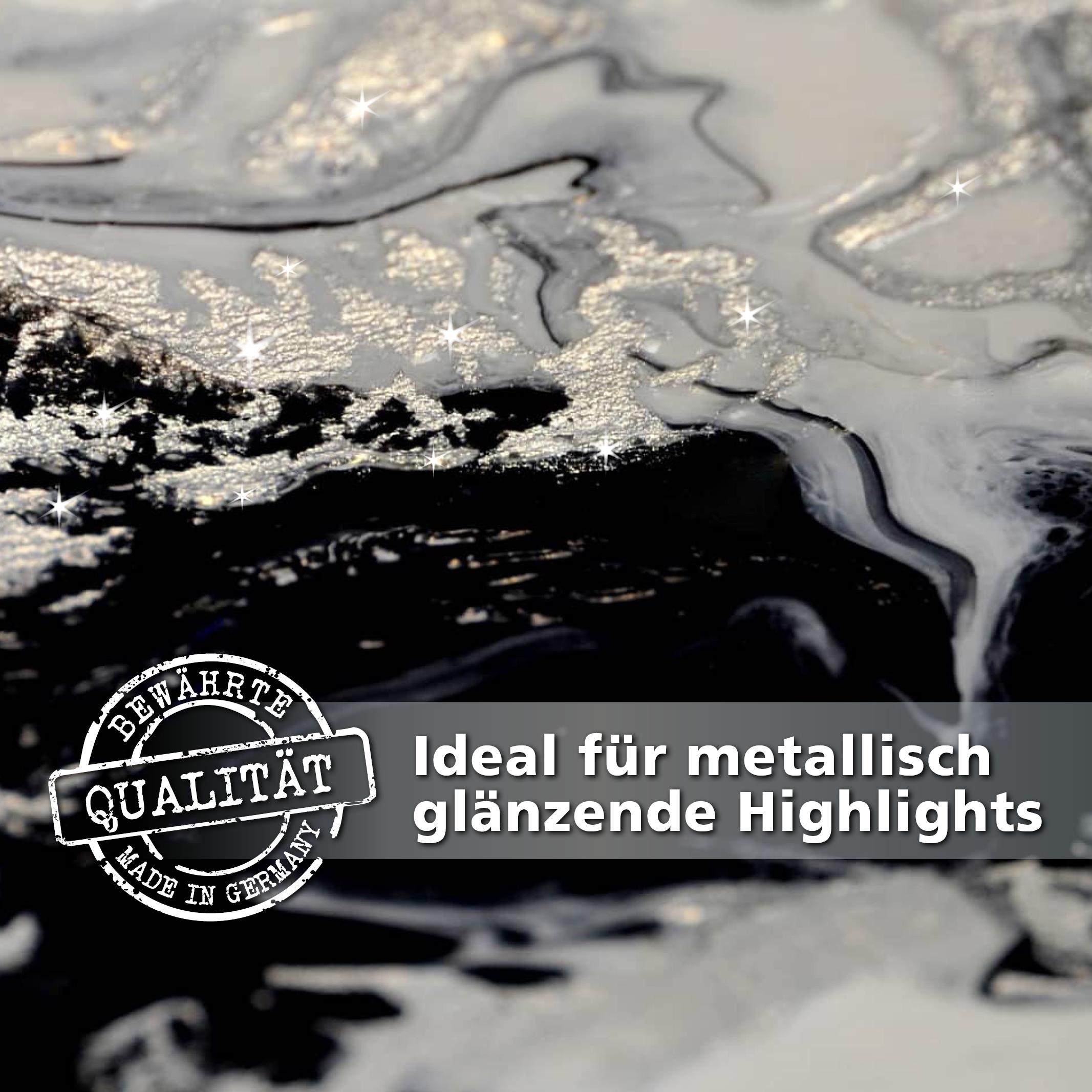 Hoewel de verf gebruiksklaar is, blijft deze uitstekend mengbaar met pouring mediums en additieven zoals siliconenolie. Dit maakt het mogelijk om de verf volledig af te stemmen op je eigen werkwijze en gewenste effecten, zonder verlies van pigmentkracht of metallic karakter.