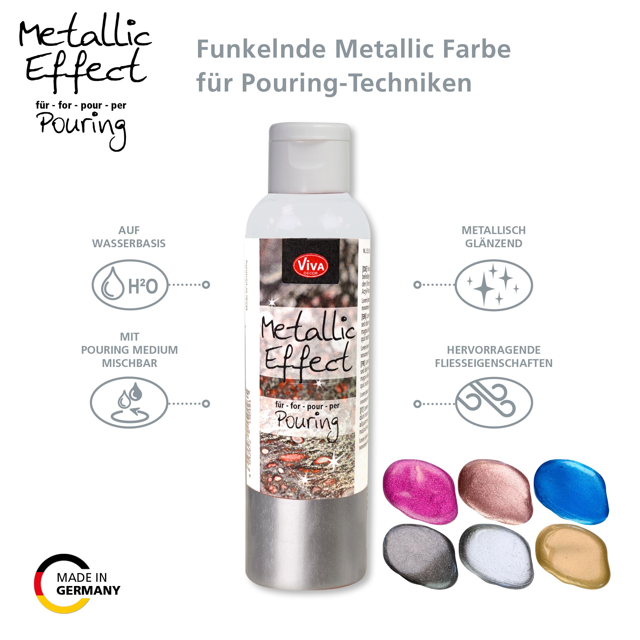 Viva Decor Metallic Effect Pouring Staal is een hoogwaardige, gebruiksklare acrylverf met een koel metallic karakter, ontwikkeld voor kunstenaars die werken met contrast, structuur en gecontroleerde vloei. De staalachtige tint bevindt zich tussen zilver en grijs en geeft een industriële, moderne uitstraling met subtiele reflectie.