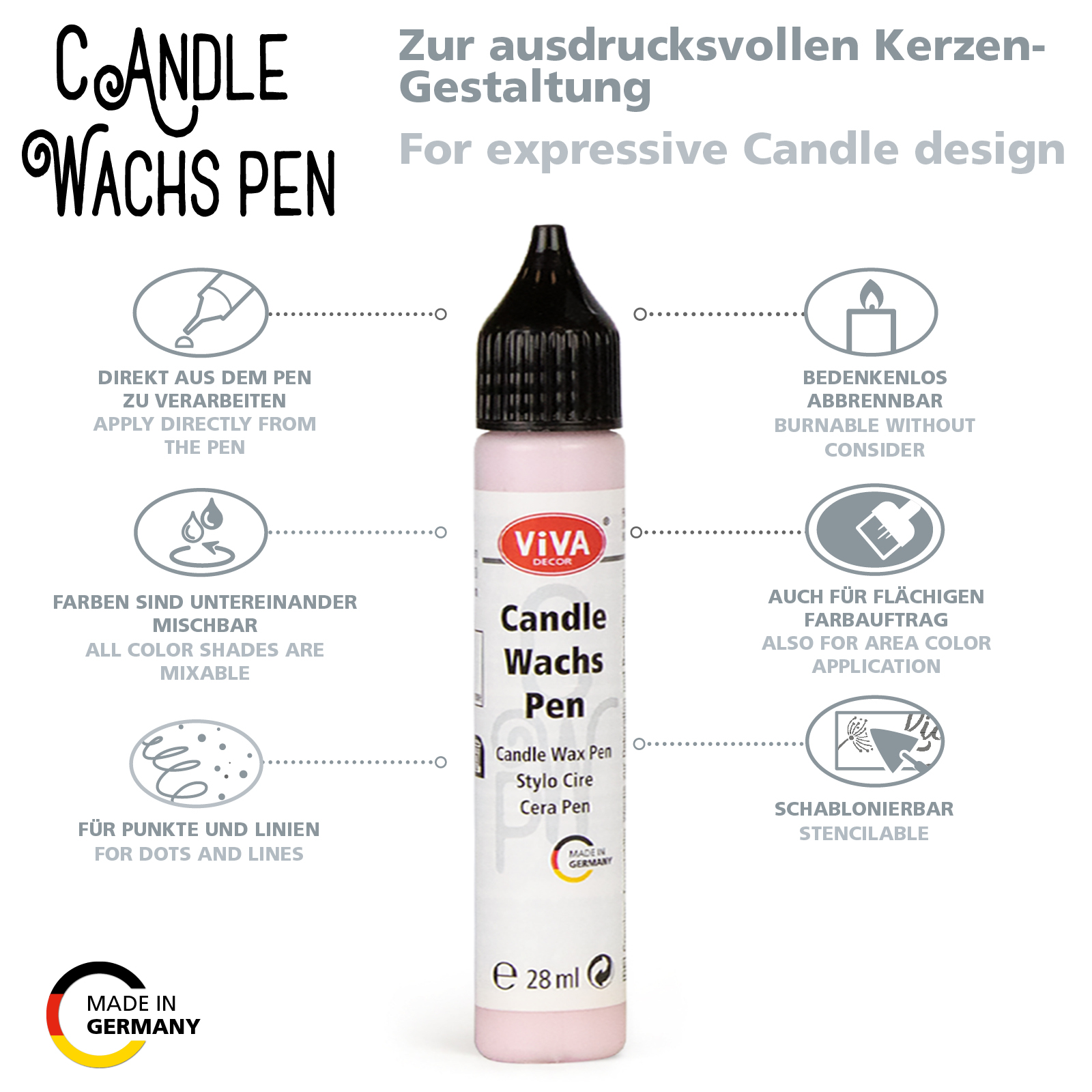 De Viva Decor Candle Wachspen Pastel 318040301 – Pastel Roze (Pastellrosa) – 28 ml is een gebruiksklare kaarsenwaspen waarmee je eenvoudig kaarsen personaliseert met fijne lijnen, stippen, teksten en sierlijke details. De zachte was blijft licht verhoogd op het oppervlak liggen en zorgt voor een subtiel reliëf / 3D-effect.