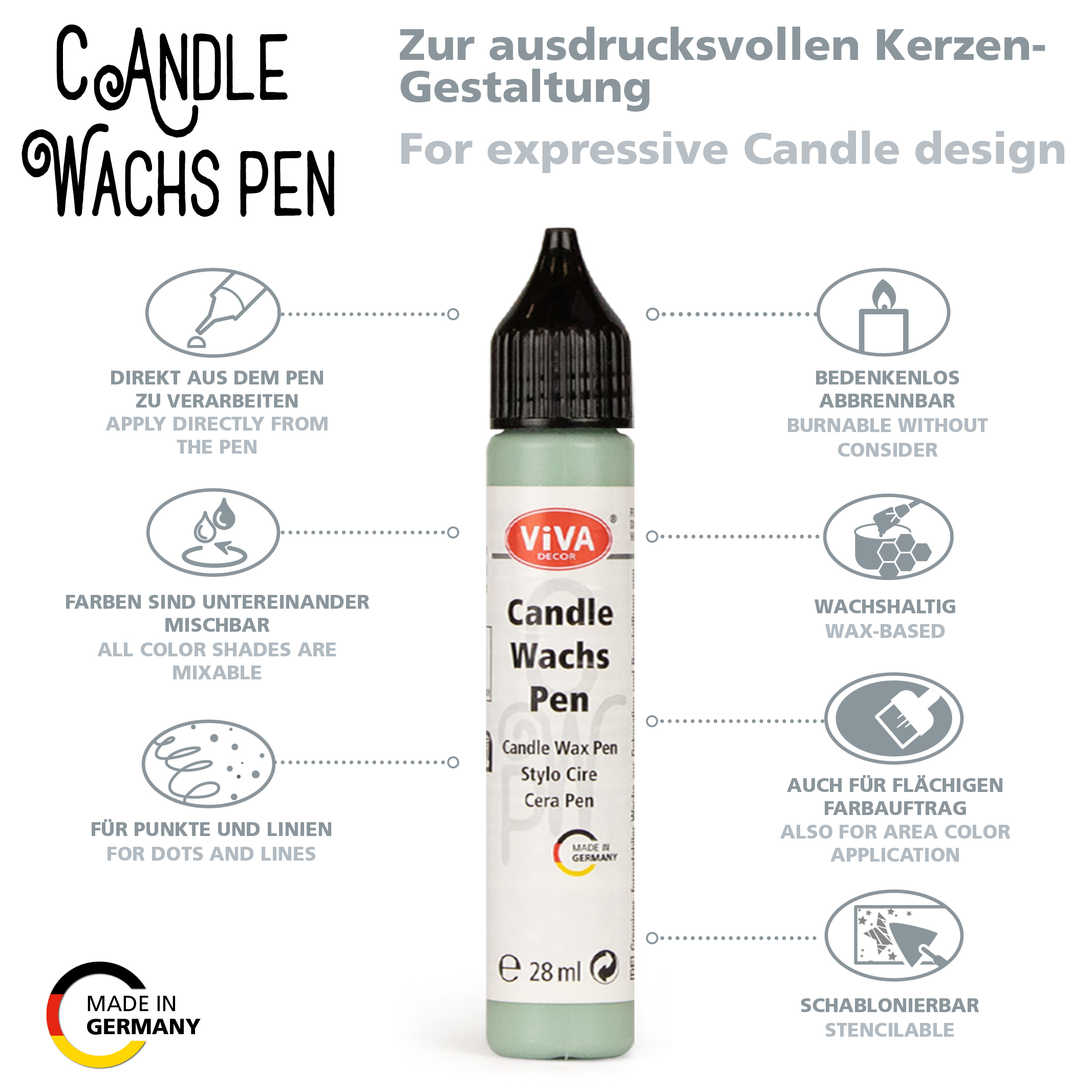 De Viva Decor Candle Wachspen Pastel 318070501 – Pastel Salbei – 28 ml is een gebruiksklare kaarsenwaspen waarmee je kaarsen eenvoudig personaliseert met fijne lijnen, stippen, teksten en decoratieve details. De romige was hecht goed op het kaarsoppervlak en blijft licht verhoogd liggen voor een subtiel 3D- en reliëfeffect.